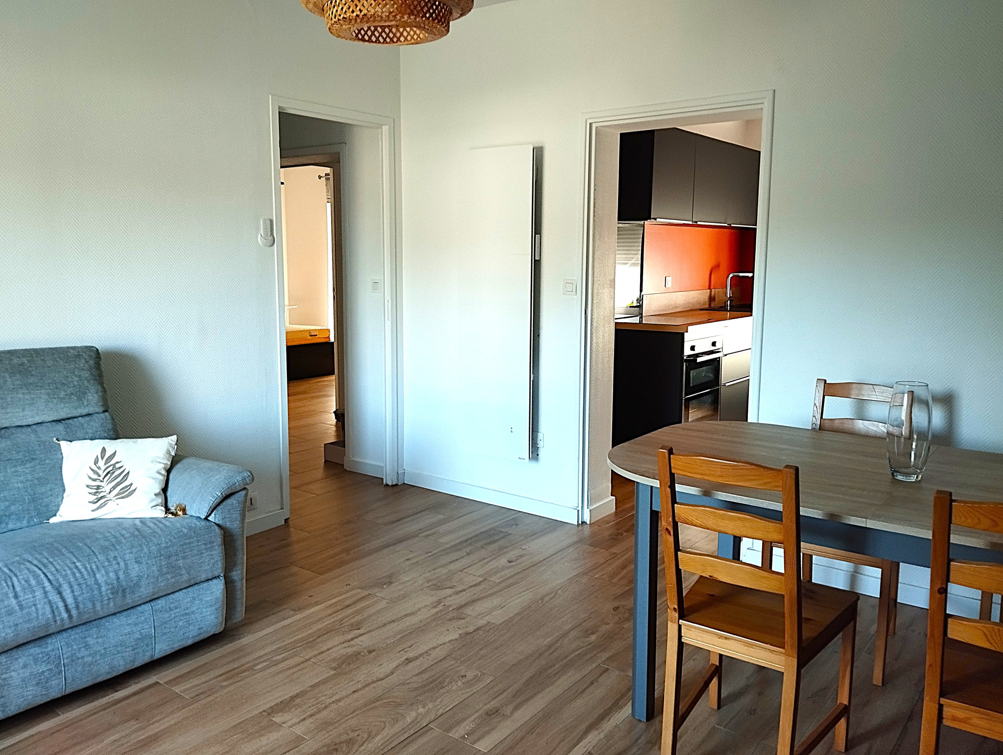 CENTRE DE BLAIN - Je vous propose ce charmant appartement T3 rénové en 2019 (cuisine aménagée, salle de bain, sols, peintures et radiateurs électriques neufs) dans petite résidence sécurisée. Au 1er étage d'une copropriété calme comprenant 4 appartements, une cour commune de 250 m² entièrement clos de mur en pierres avec portail électrique et deux places de stationnement privatives, un local vélo et une grande cave. L'appartement offre une entrée, un espace de vie de 25m² avec séjour et cuisine aménagée et entièrement équipée (four, hotte, lave-vaisselle, frigo/congélateur), une salle de bain /wc refaite récemment, et deux grandes chambres de 14 m² avec grands dressings. L'appartement peut être vendu vide ou meublé. Informations sur la copropriété: Nombre de lots: 10 Charges mensuelles: 110 € / mois Pas de procédure judiciaire en cours.